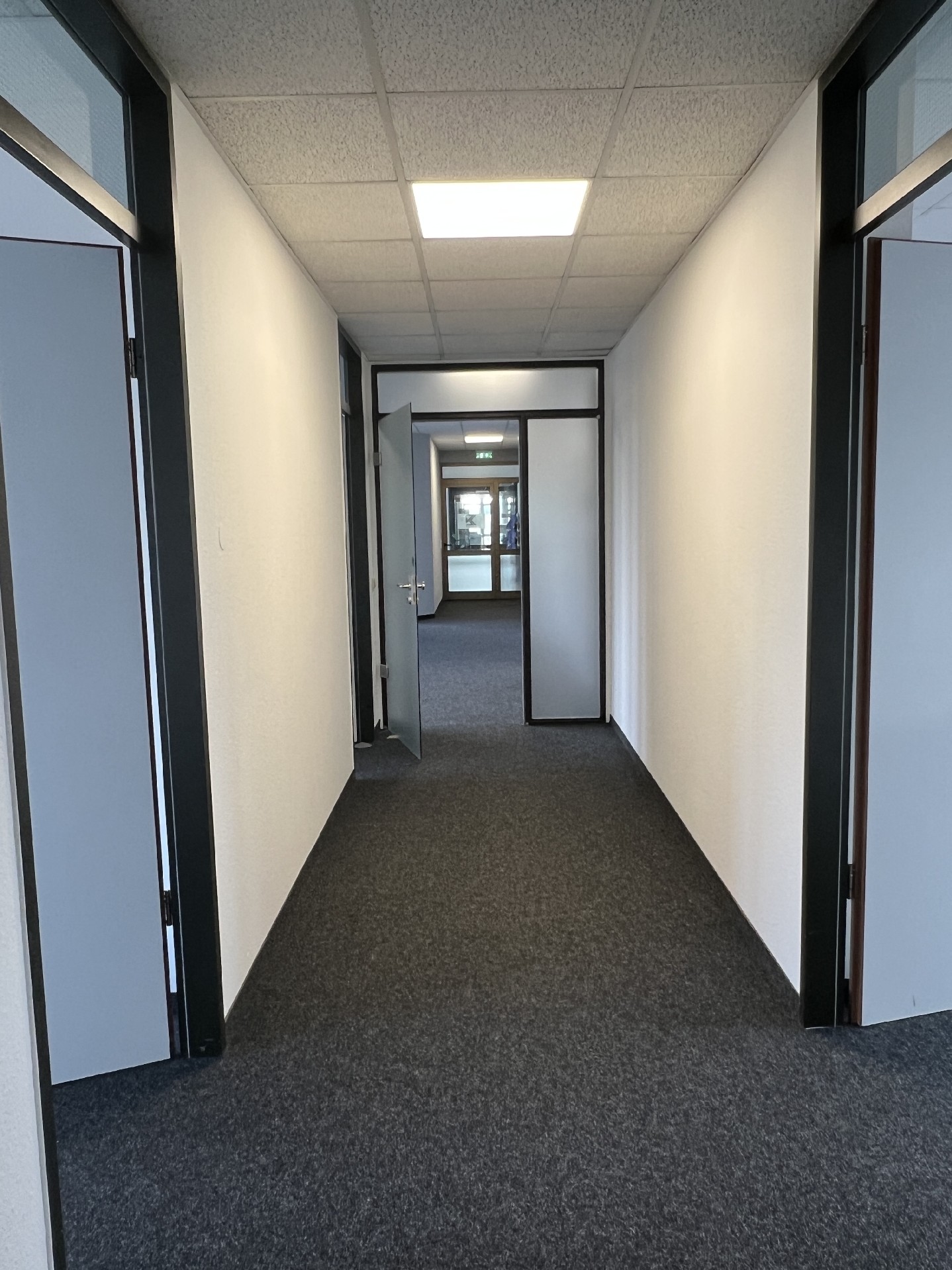 Diese flexible Bürofläche befindet sich im 1. Obergeschoss eines 3-geschossigen Büro- und Geschäftshauses. Über einen Aufzug ist die Einheit stufenfrei erreichbar. Auf dem hauseigenen Parkplatz sind PKW-Stellplätze anmietbar, die für eine bequeme Anfahrt für Ihre Kunden und Mitarbeiter sorgen. Die Bürofläche ist als klassischer 2-Spänner mit Mittelflur aufgeteilt. Es gibt eine Mischung aus 1-2-Personen-Büros und Großraum-Büros. Alle Räume sind natürlich belüftet und durch die großen Fenster bestens belichtet. Der außenliegende Sonnenschutz sorgt für ein angenehmes Arbeitsklima, auch an warmen Sommertagen. In den Büros ist der Boden mit einem Teppichbodenbelag versehen. In den vorhandenen Kabelkanälen liegt eine CAT-5-Verkabelung. Eine Beleuchtung ist bereits in die vorhandene Odenwald-Rasterdecke integriert.