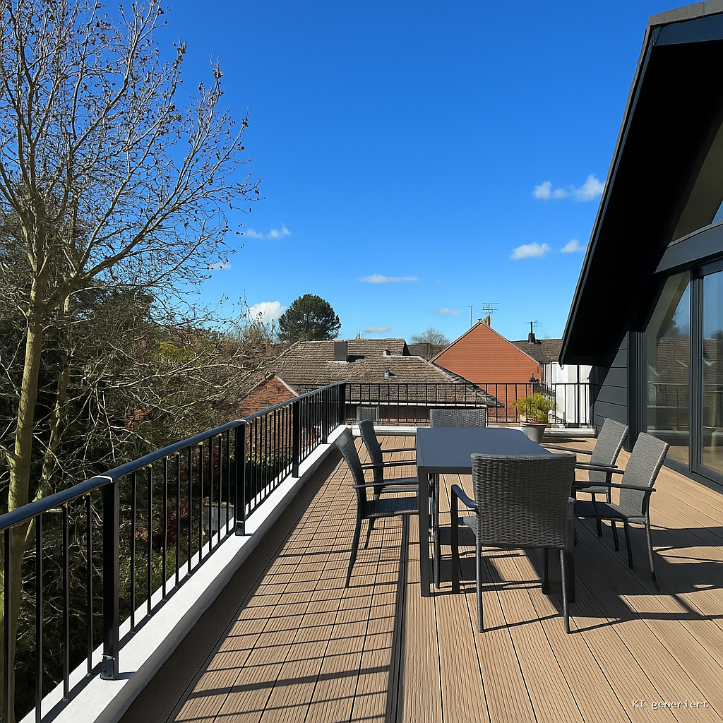 Eine große Dachterrasse auf der Rückseite (Grundfläche ca. 36 m²) und ein Balkon auf der Frontseite des Hauses (Grundfläche ca. 12 m²) bieten ideale Voraussetzungen für entspannte und kreative Verschnaufpausen unter freiem Himmel.