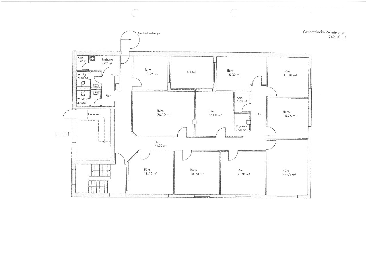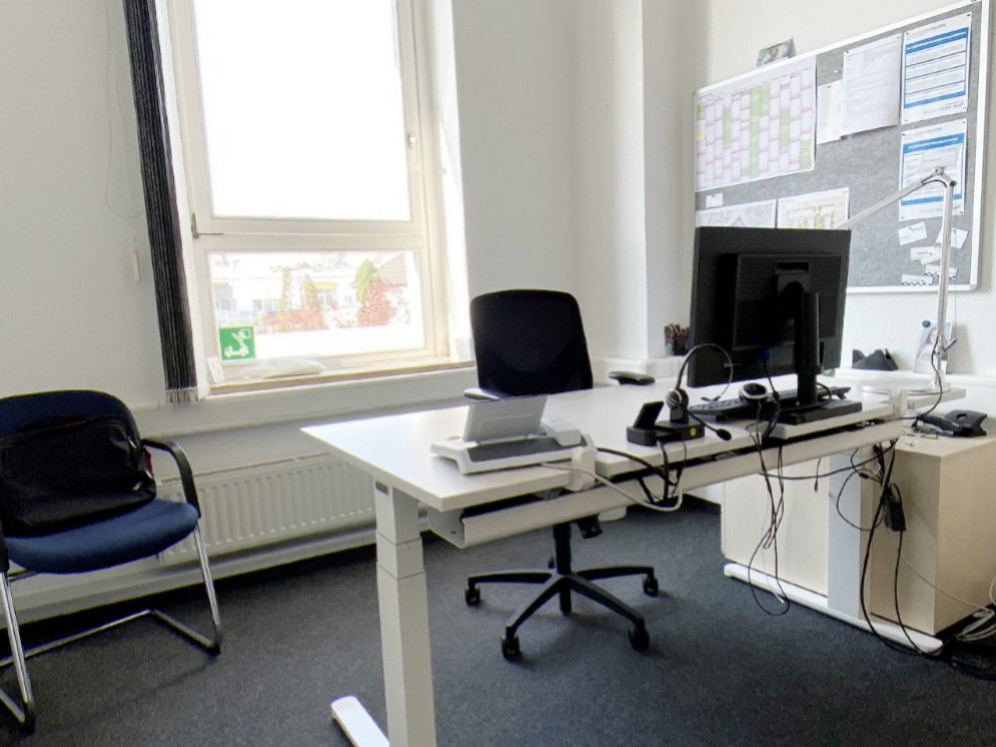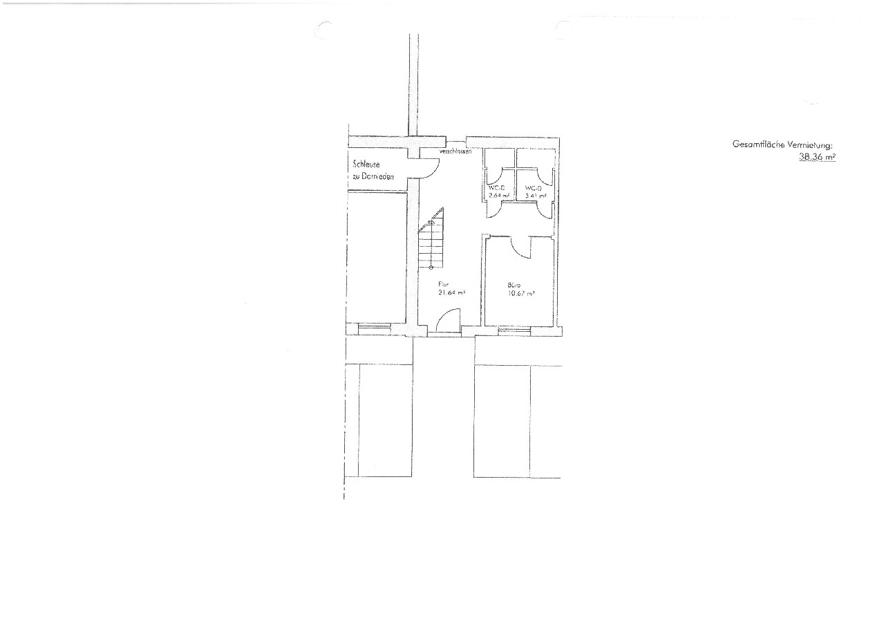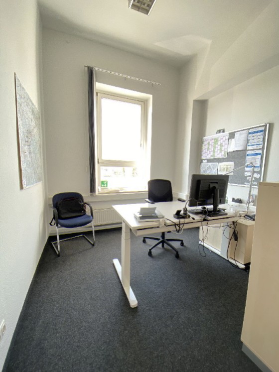 Die helle Bürofläche befindet sich im Erd- u. 1. Obergeschoss des 2-geschossigen Verwaltungsgebäudes. Im Erdgeschoss befindet sich ein Besprechungs- oder Empfangsraum. Über das sehr gepflegte Treppenhaus gelangen Sie in die Räume des Obergeschosses.