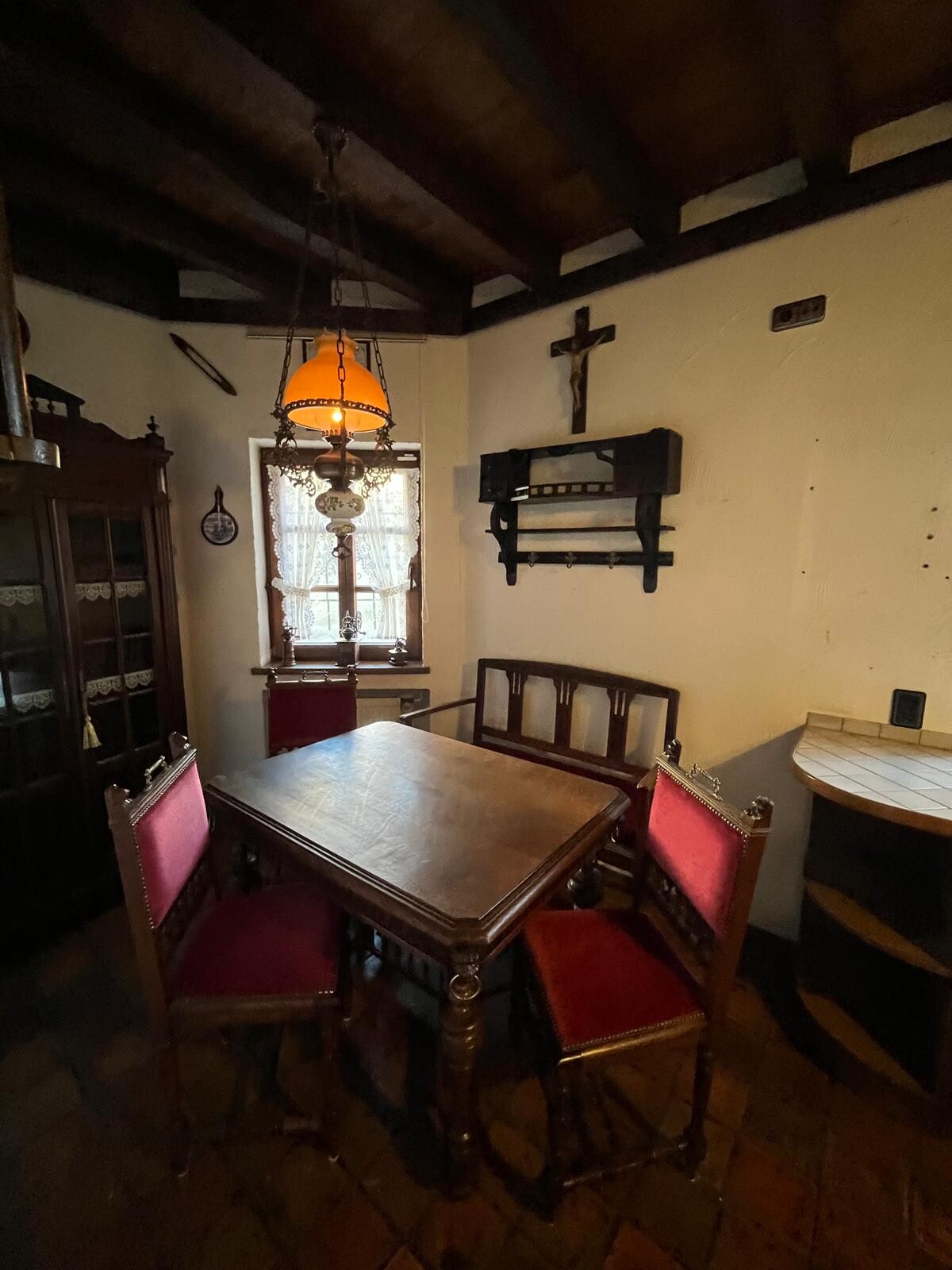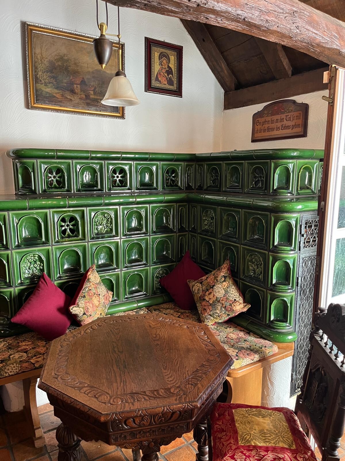Eine Holzbalkenkonstruktion sowie ein während der Sanierung, nach historischem Vorbild erbauter Kachelofen sorgen für ein gemütliches Ambiente.