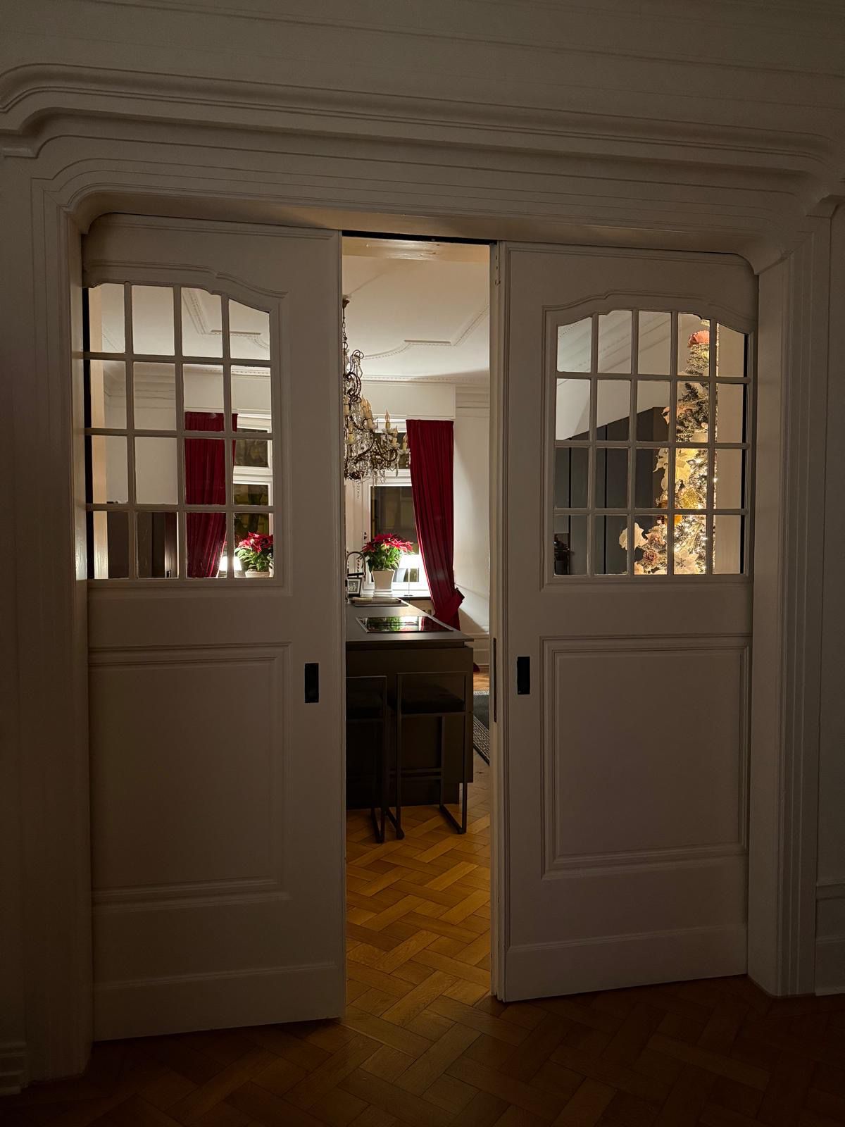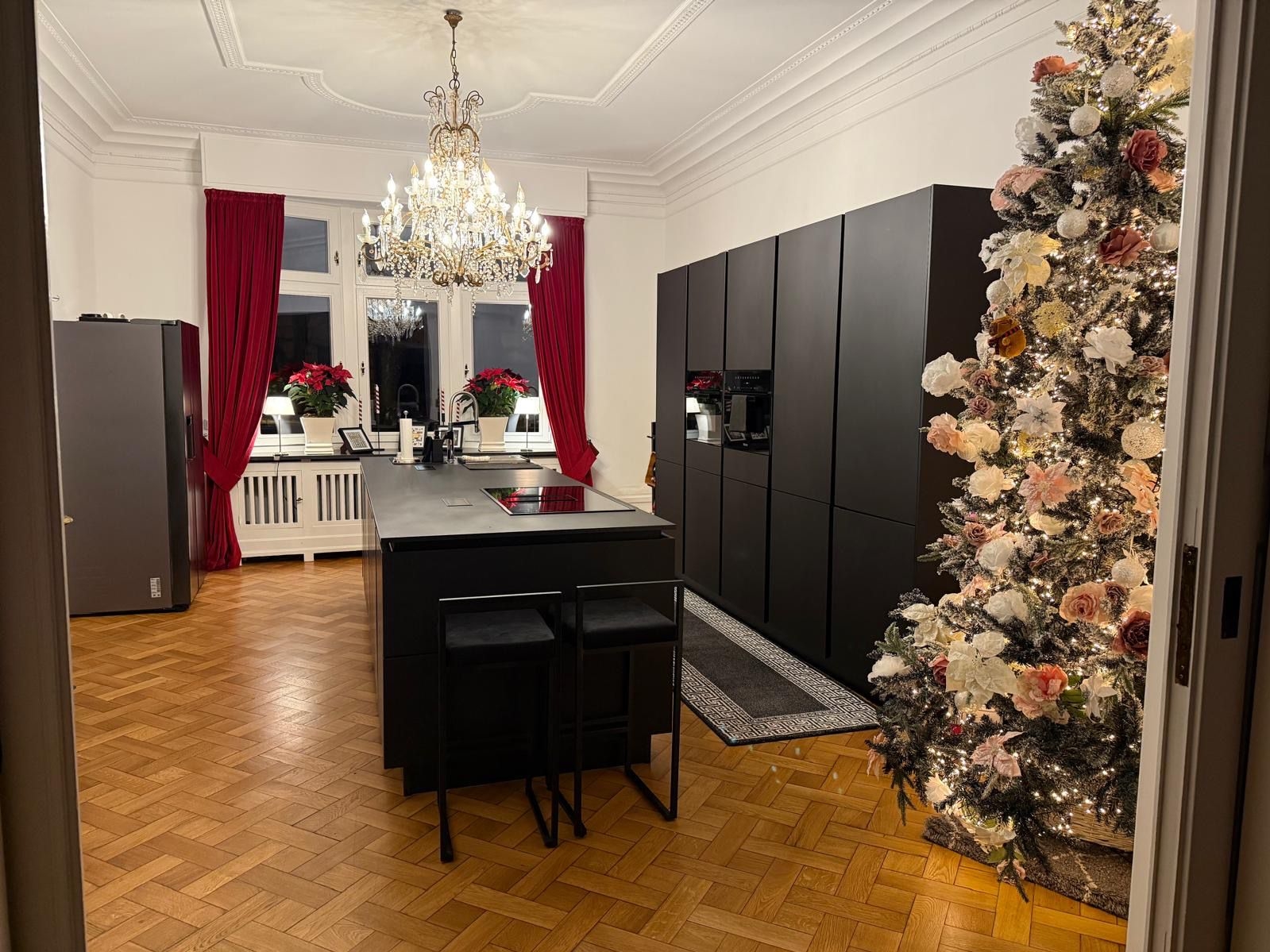 Sie bietet ein herrschaftliches Wohn-/Esszimmer mit herrlichem Blick in den Garten. Eine große Küche ist durch eine Doppel-Schiebetür vom Wohnzimmer getrennt. Edle Parkettböden, historische Heizkörperverzierungen, Fensterbänke aus belgischem Granit sowie hohe Decken mit aufwendigen Stuckelementen verleihen dieser Wohnung einen besonderen Charme, den Neubauten nicht erzeugen können.