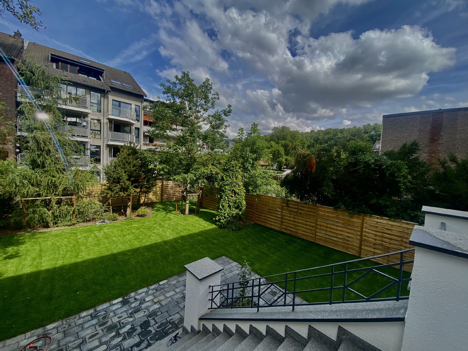 Angrenzend an das Wohnzimmer befindet sich eine kleine Terrasse. Über eine imposante Treppe erreichen Sie den Garten, für den die Erdgeschossmieter das alleinige Nutzungsrecht erhalten.