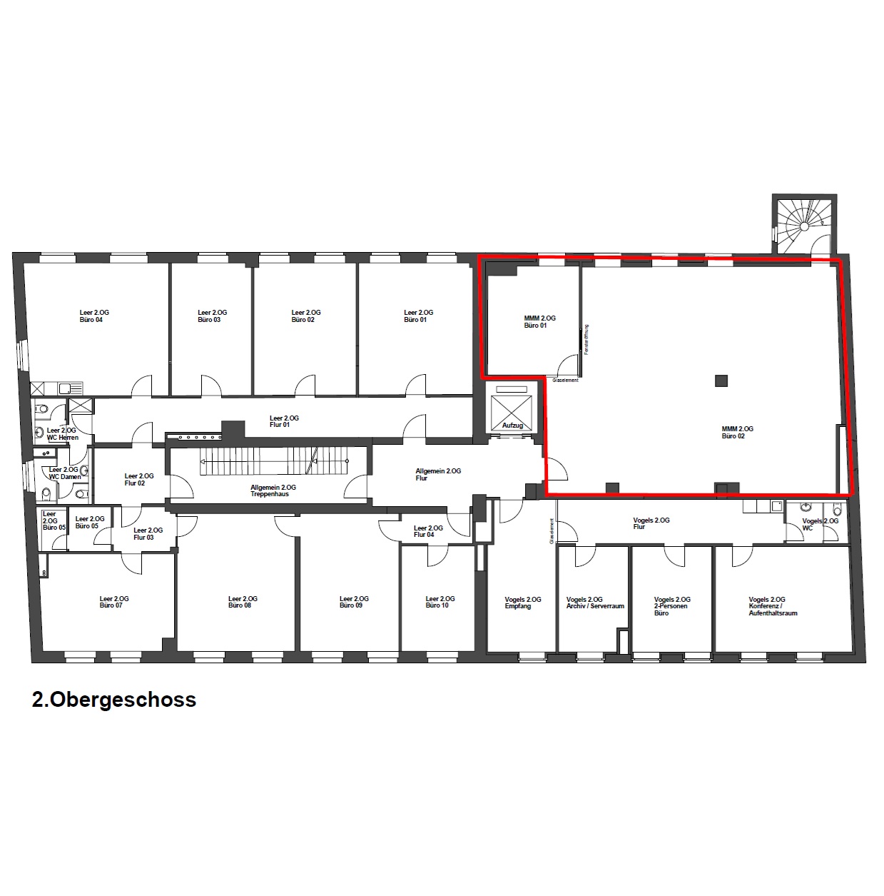 Die Mietfläche befindet sich im 2. Obergeschoss eines gepflegten Bürogebäudes. Die Mieteinheit besteht aus einem Großraumbüro mit integrierter Teeküche sowie einem separaten Einzelbüro. Eine WC-Anlage wird in Absprache mit dem Mieter installiert.