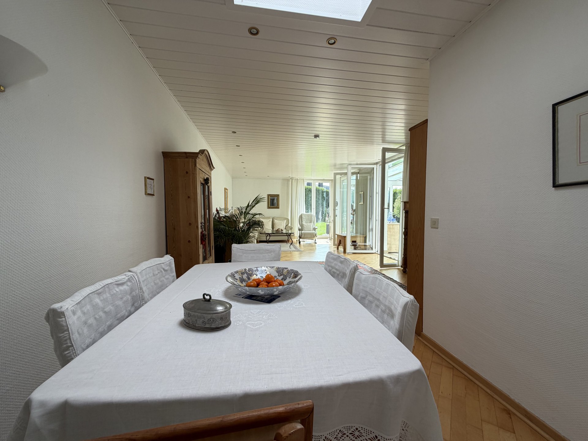 Die Wohnräume sind sehr gut belichtet und hervorragend aufgeteilt. Von der Eingangsdiele gelangen Sie linksseitig in den Wohn-/Essbereich mit offener Küche, Zugang zum Wintergarten, Garderobe und kleinem Gäste-WC. Rechtsseitig gelangen Sie in den Schlaf- und Arbeitsbereich. Hier finden Sie 4 Schlaf- bzw. Arbeits- oder Kinderzimmer und ein natürlich belüftetes Wannen- und Duschbad.