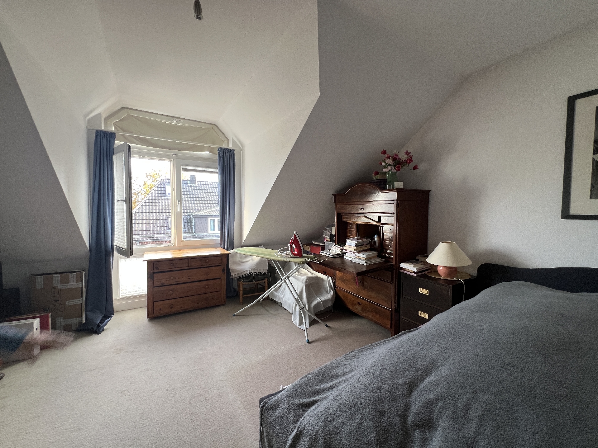 Linker Hand befindet sich das geräumige Schlafzimmer mit komfortabler Dachgaube. Die Dachschrägen in den Ecken verleihen dem Raum eine Gemütlichkeit, ohne die Wohnfläche zu sehr einzuschränken.